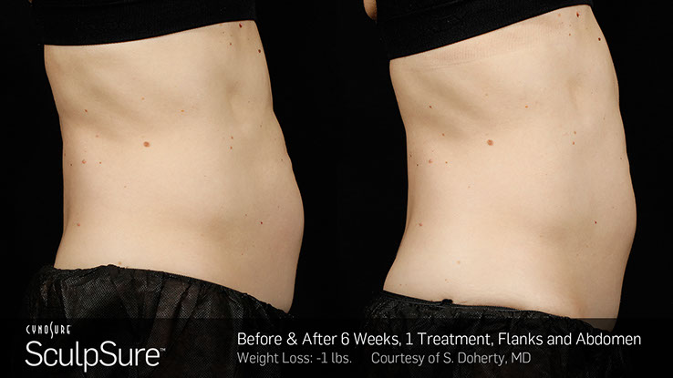 One Warm Sculpting with Sculpsure treatment lasts less than a half hour and can treat multiple areas at once. Some patients begin to notice results as soon as 6 weeks following fat reduction treatment, but best results are typically seen after 12 weeks. A slight tingling sensation may be felt during SculpSure treatment, but it is usually well-tolerated2 by most patients. Body contouring has few side effects, which most often include mild swelling, tenderness, and redness. Most patients are able to return to their regular routines following treatment without any downtime.